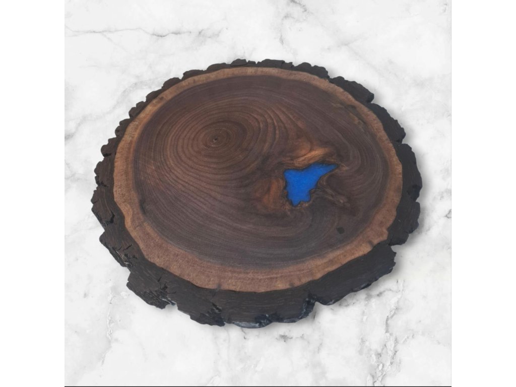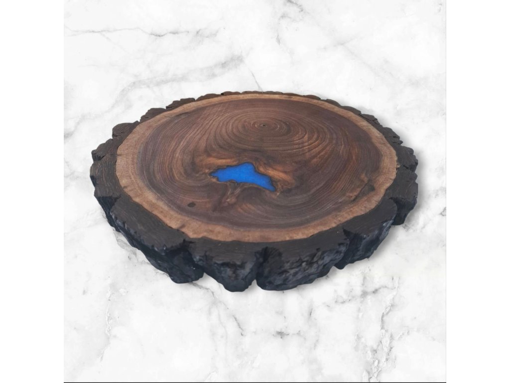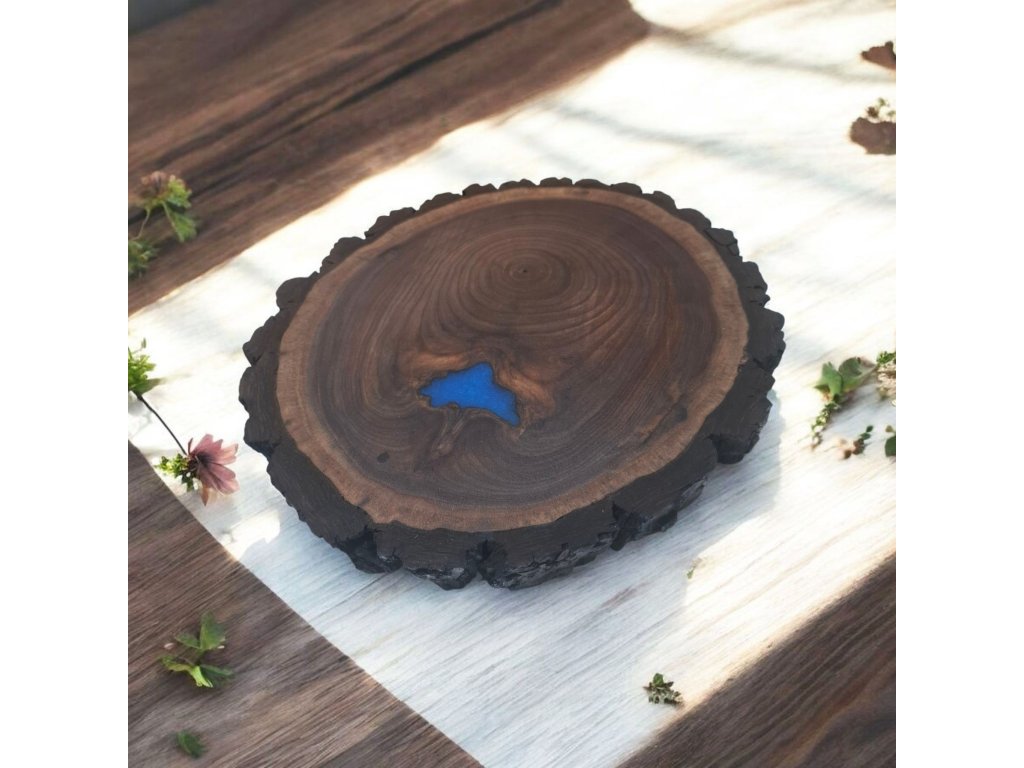 Ozdobte svůj stůl s originální dekorací vyrobenou z masivního amerického ořechu. Každý kus je jedinečný díky přirozené kresbě dřeva a ponechané kůře na okraji, která zachovává skutečný charakter kmene. Uprostřed podložky se nachází drobná „kapka“ modré epoxidové pryskyřice, která dodává výrobku moderní, ale stále velmi přírodní vzhled.