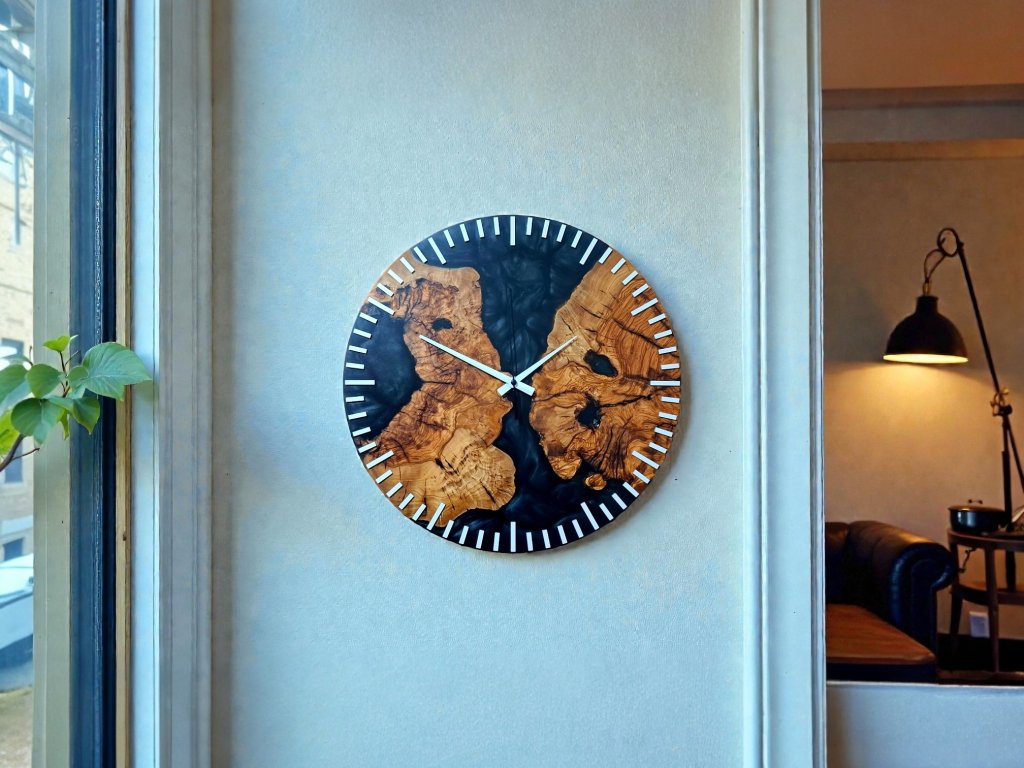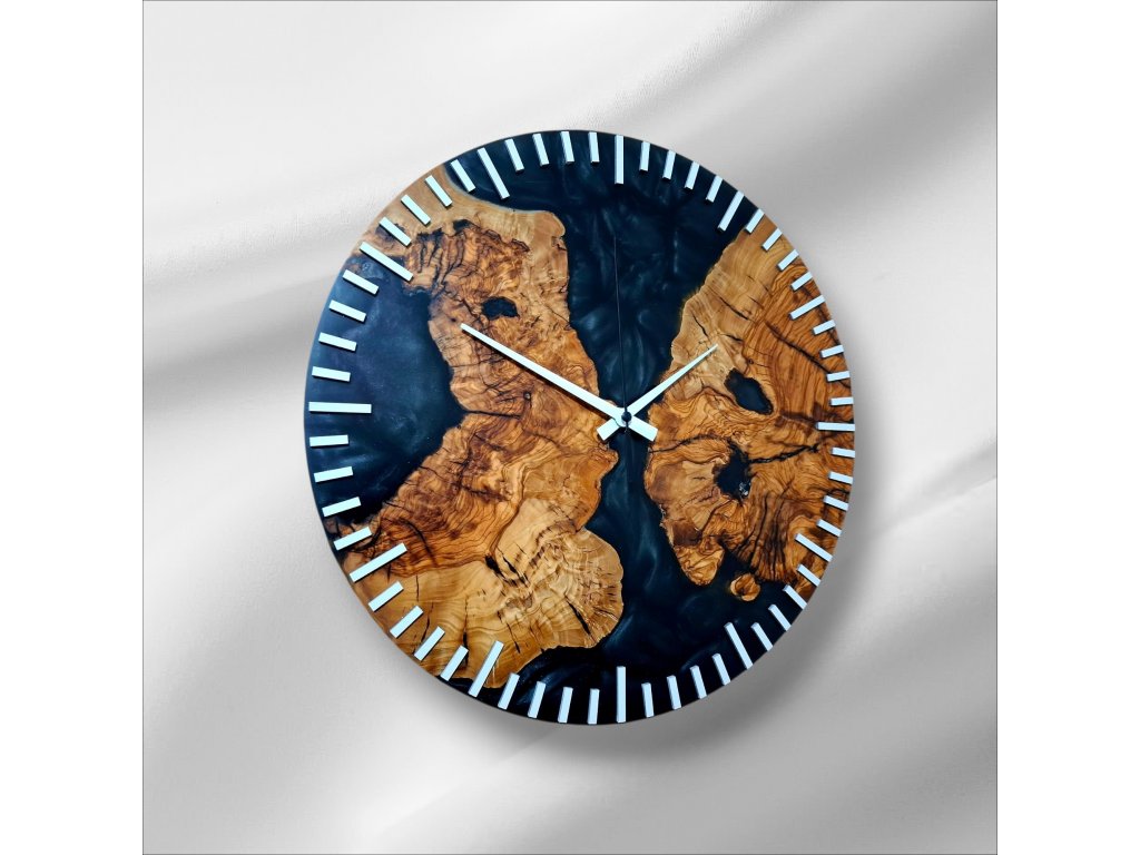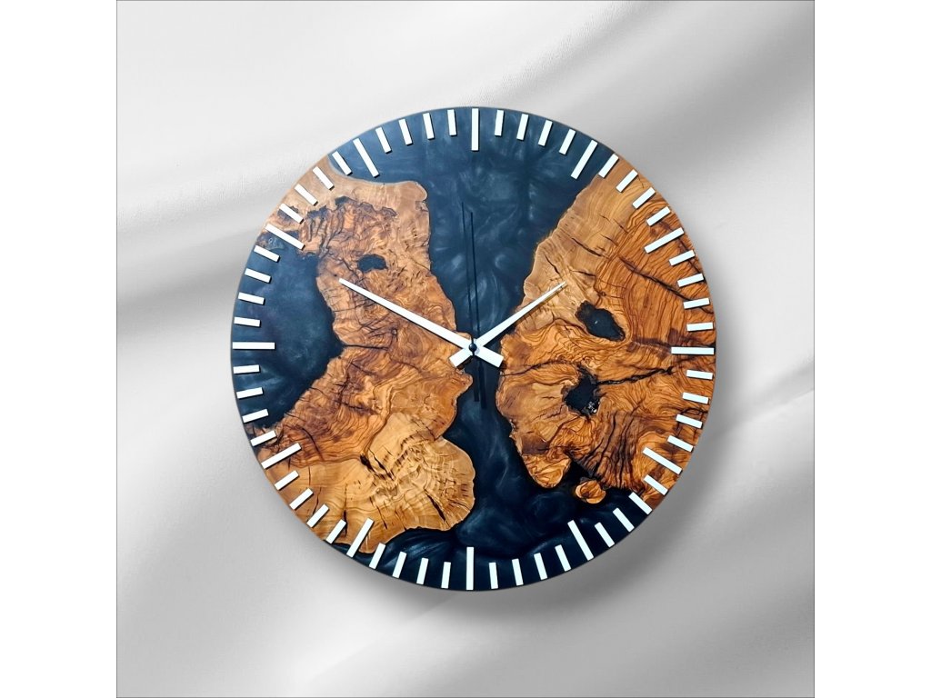 Dodejte svému interiéru originální nádech přírody a elegance s těmito ručně vyráběnými hodinami, které propojují unikátní kresbu olivového dřeva a moderní černý epoxid. Výsledkem je jedinečný designový kousek, který se stane dominantou každé místnosti.