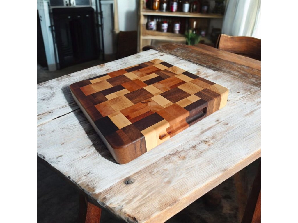 Objevte krásu a funkčnost v jednom! Tato ručně vyráběná masivní, oboustranná krájecí deska je výsledkem poctivé práce a precizního výběru těch nejlepších dřevin. Kombinace ořechu, amerického ořechu, jasanu, javoru, třešně a buku vytváří jedinečný mozaikový vzor, díky kterému je každá deska originálním kusem, který nikde jinde nenajdete.