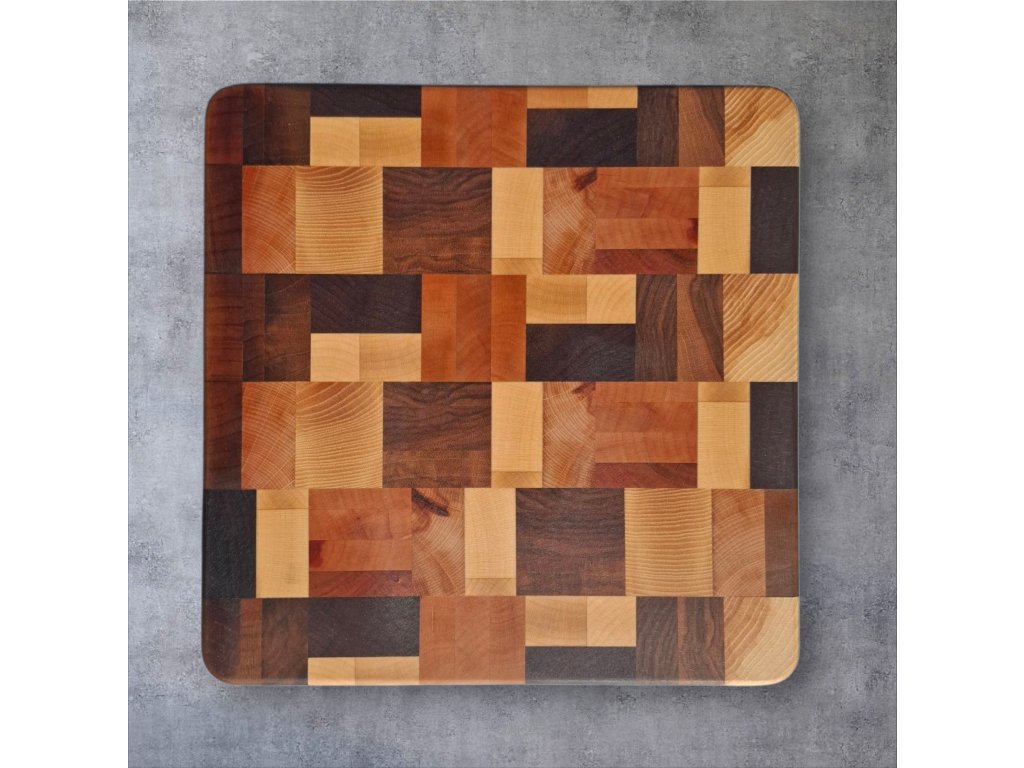 Tato prémiová krájecí deska je vyrobená z kombinace kvalitních dřev – ořech, americký ořech, jasan, javor, třešeň a buk. Spojením těchto druhů vznikl jedinečný mozaikový vzor, díky kterému je každá deska naprostý originál.