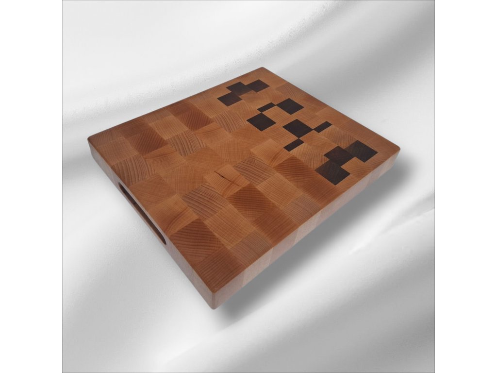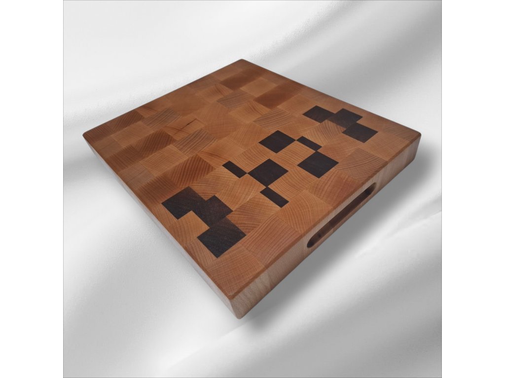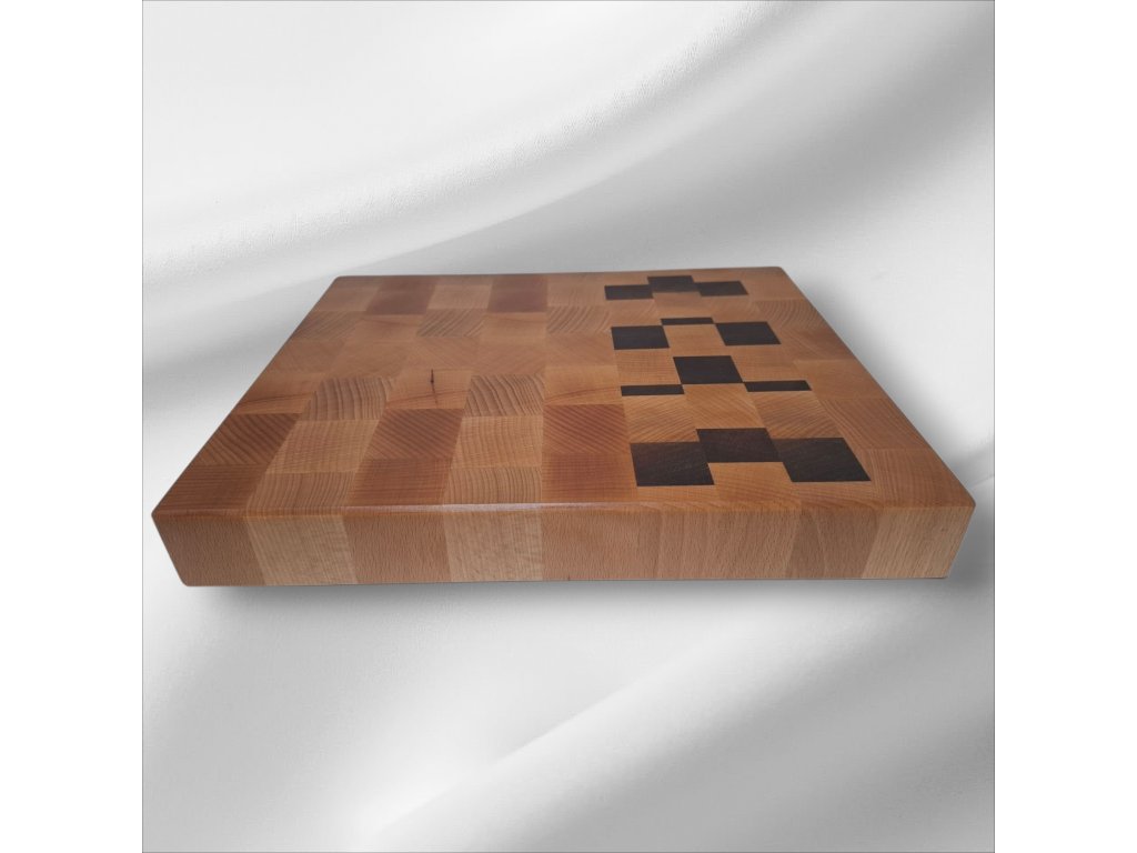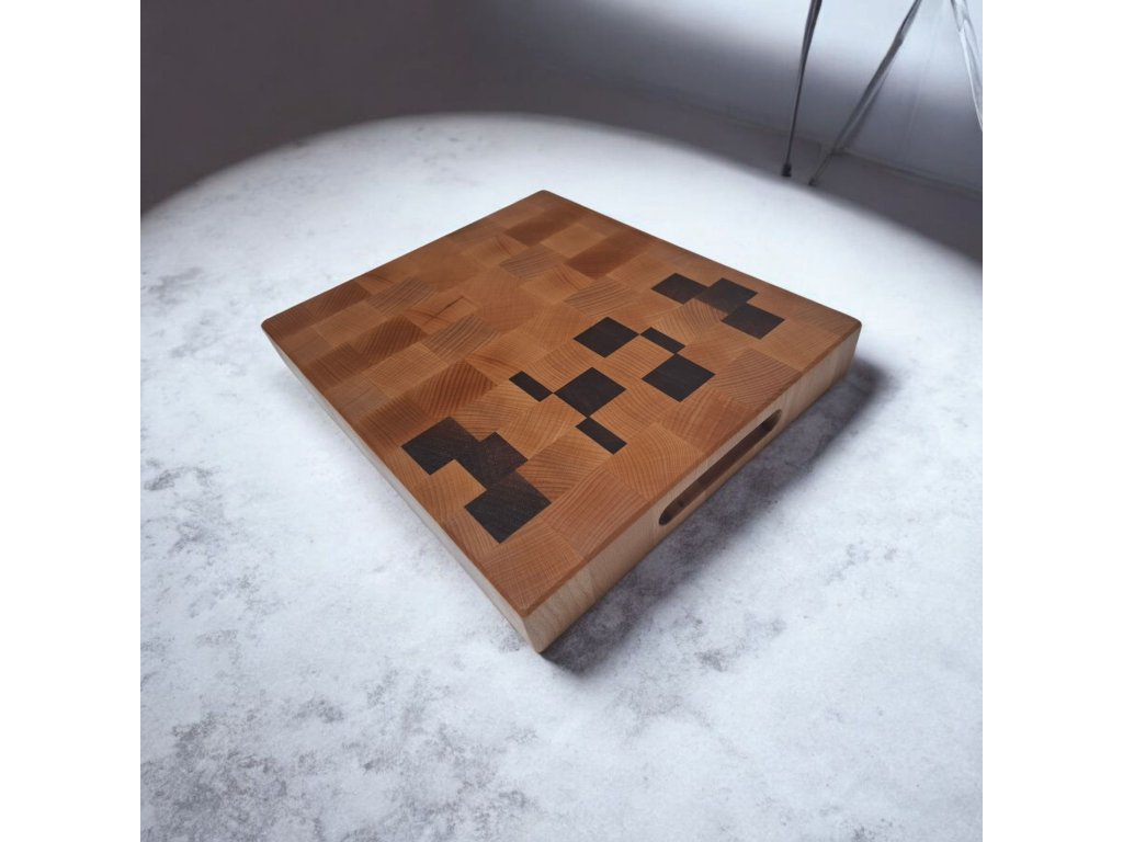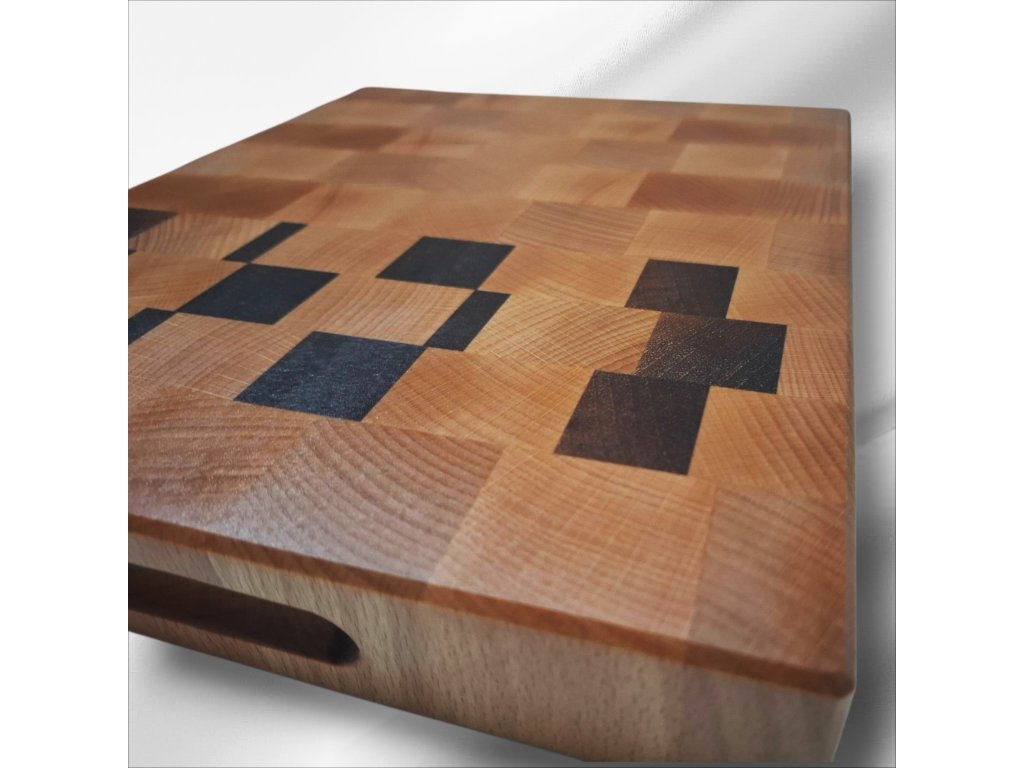 Prémiová end-grain krájecí deska vyrobená z kombinace bukového dřeva a tmavých proužků amerického ořechu, které vytváří elegantní a moderní mozaikový vzor. End-grain konstrukce zajišťuje vysokou odolnost, šetrnost k nožům a dlouhou životnost. Prkno je opatřeno frézovanými úchyty z bočních stran pro pohodlnou manipulaci a je vhodné k oboustrannému použití , kdy jedna strana slouží na krájení, druhá například na servírování.