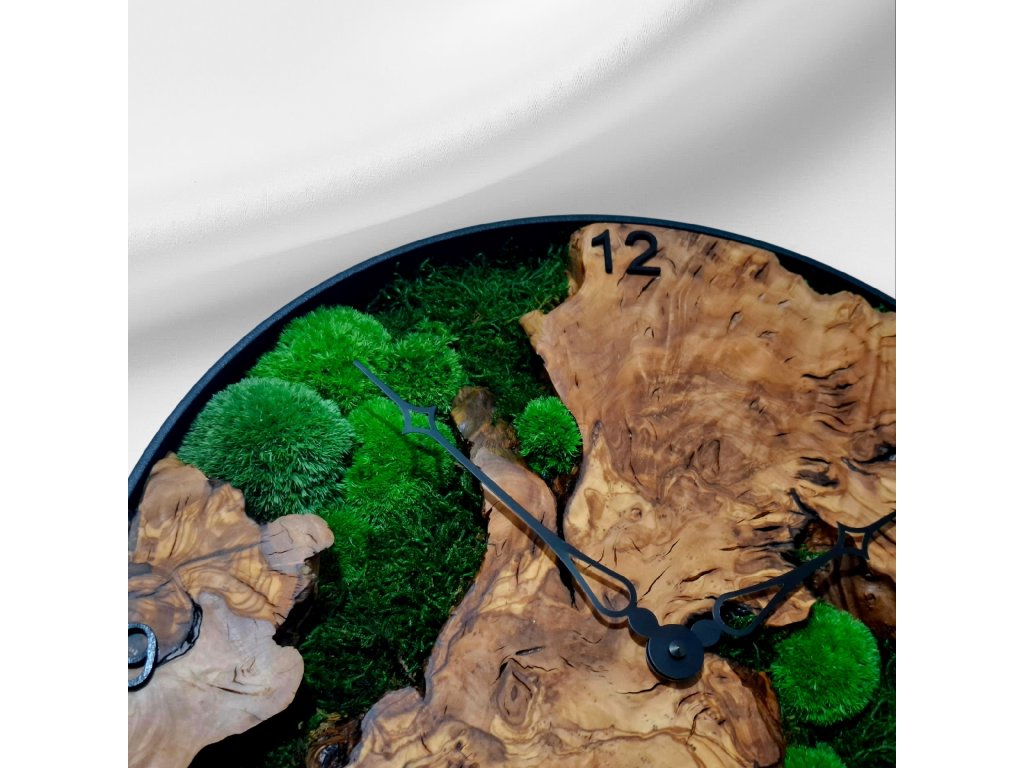 Spojení přírody a elegance v jednom kousku. Tyto ručně vyráběné nástěnné hodiny představují jedinečný doplněk, který do vašeho interiéru vnese kus živé přírody i originální umělecký prvek. Základ hodin tvoří masivní olivové dřevo s výraznou kresbou a teplým odstínem, doplněné o stabilizovaný plochý mech a prémiový kopečkový mech. Díky kombinaci těchto materiálů vzniká harmonický kontrast mezi strukturou dřeva a sytě zelenou barvou mechu.