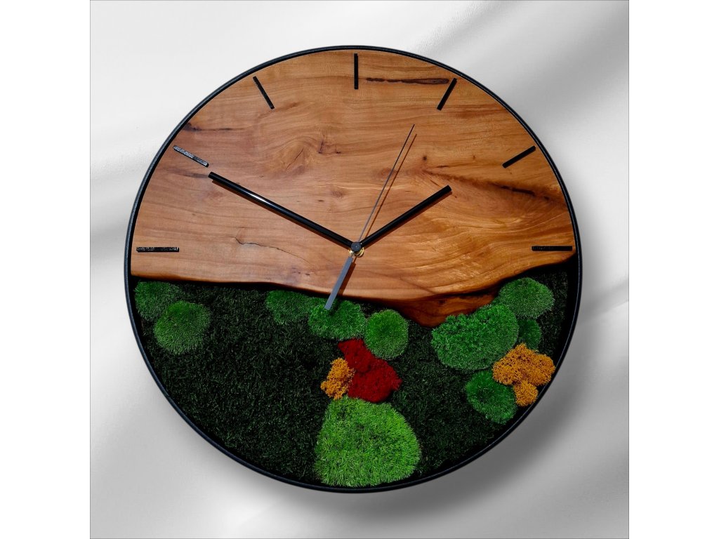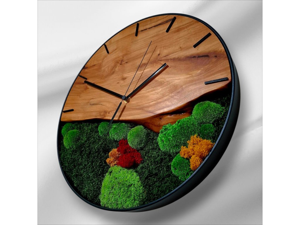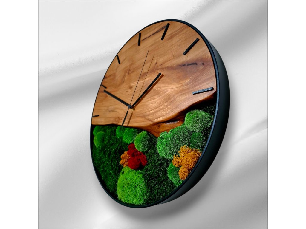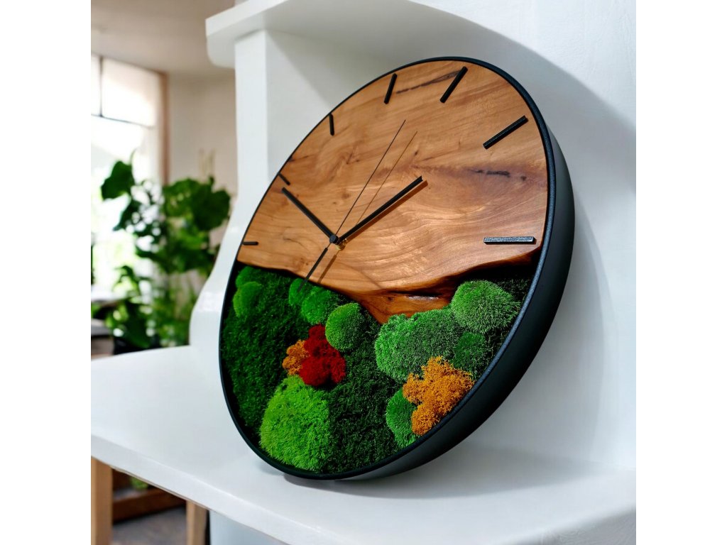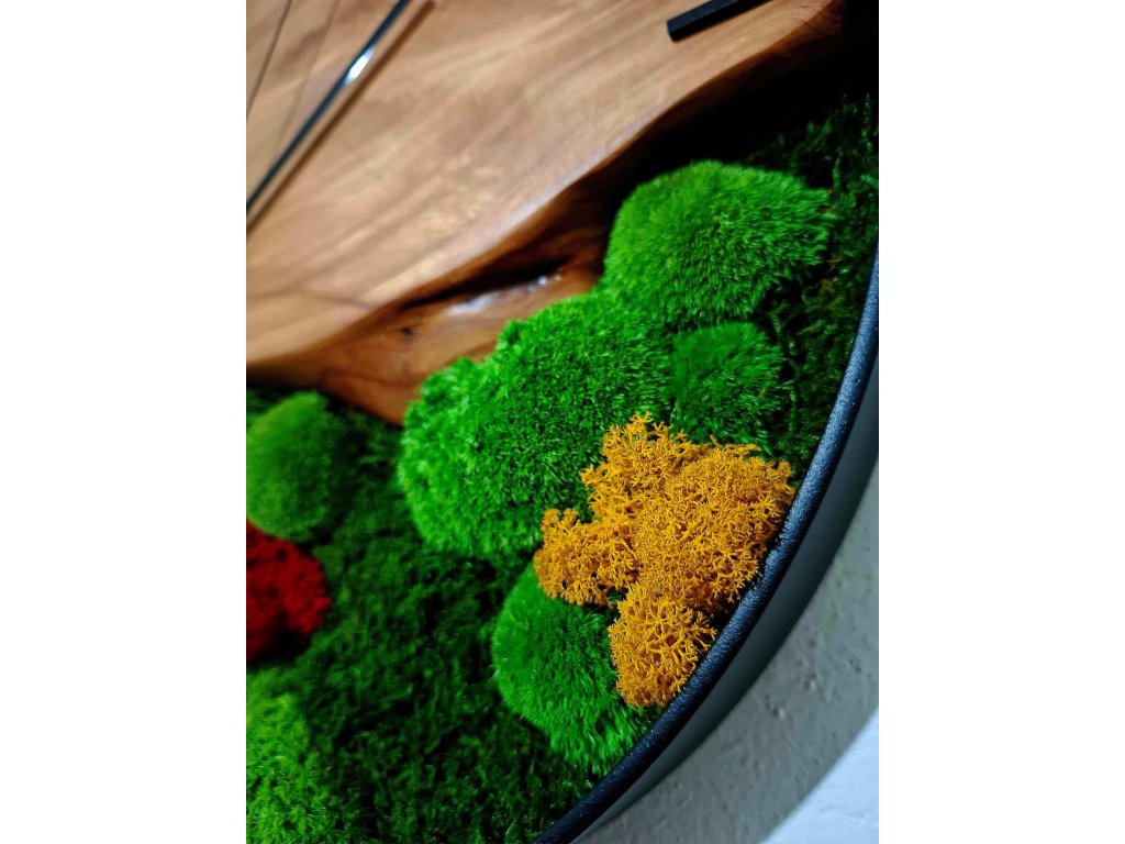 Spodní část ciferníku tvoří kompozice ze tří druhů stabilizovaného mechu – kopečkového, plochého a sobího barevného. Tyto druhy mechu vytvářejí zajímavou texturu a barevnou hloubku, díky níž hodiny působí jako malý kousek přírody přímo ve vašem interiéru. Mech nevyžaduje žádnou údržbu, neztrácí barvu ani tvar a zachovává si svůj přirozený vzhled po mnoho let. Více o mechu a jeho údržbě, si můžete přečíst ve článku ZDE.