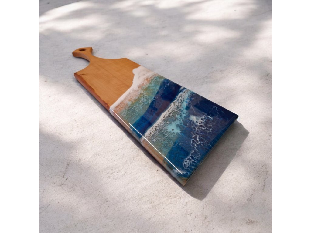 Originální servírovací prkénko spojuje přírodní dřevo s luxusním epoxidovým designem připomínajícím mořské vlny. Epoxidová část má certifikát pro styk s potravinami a dodává prkénku jedinečný vzhled, díky kterému se stane ozdobou každého stolu.
