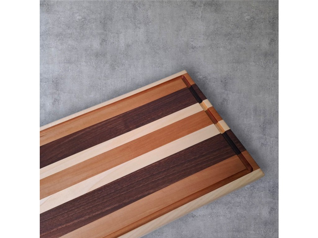 Tato ručně vyráběná servírovací a krájecí deska je nejen praktickým pomocníkem, ale i elegantním doplňkem každé kuchyně či jídelního stolu. Kombinace amerického ořechu, javoru a švestky dodává desce originální vzhled s krásně kontrastními pruhy přírodního dřeva.