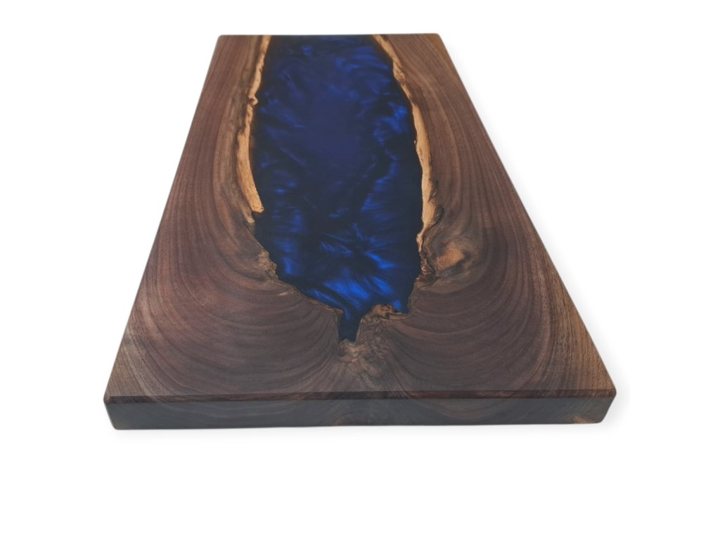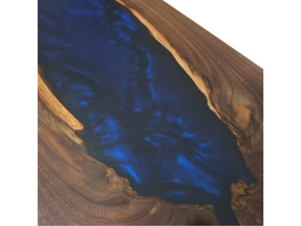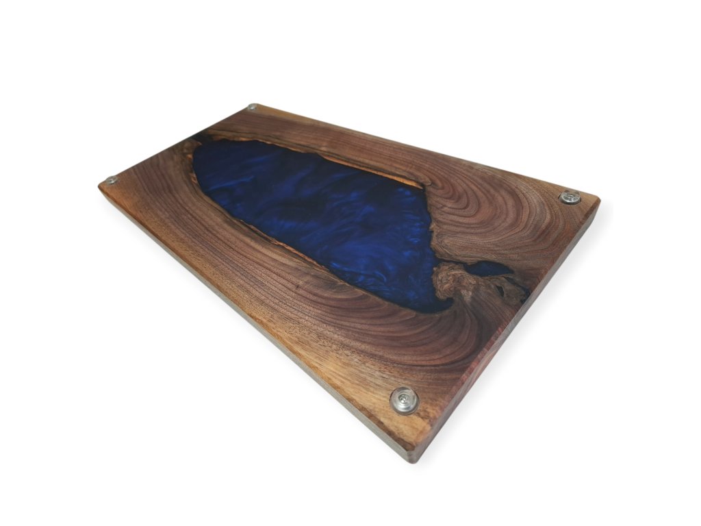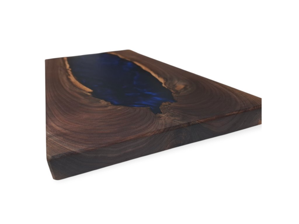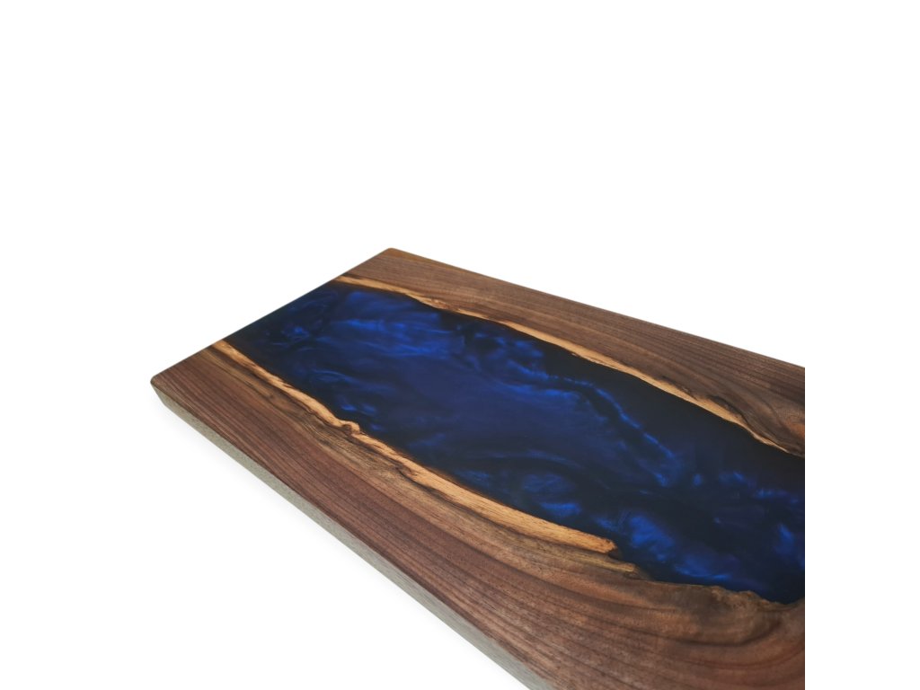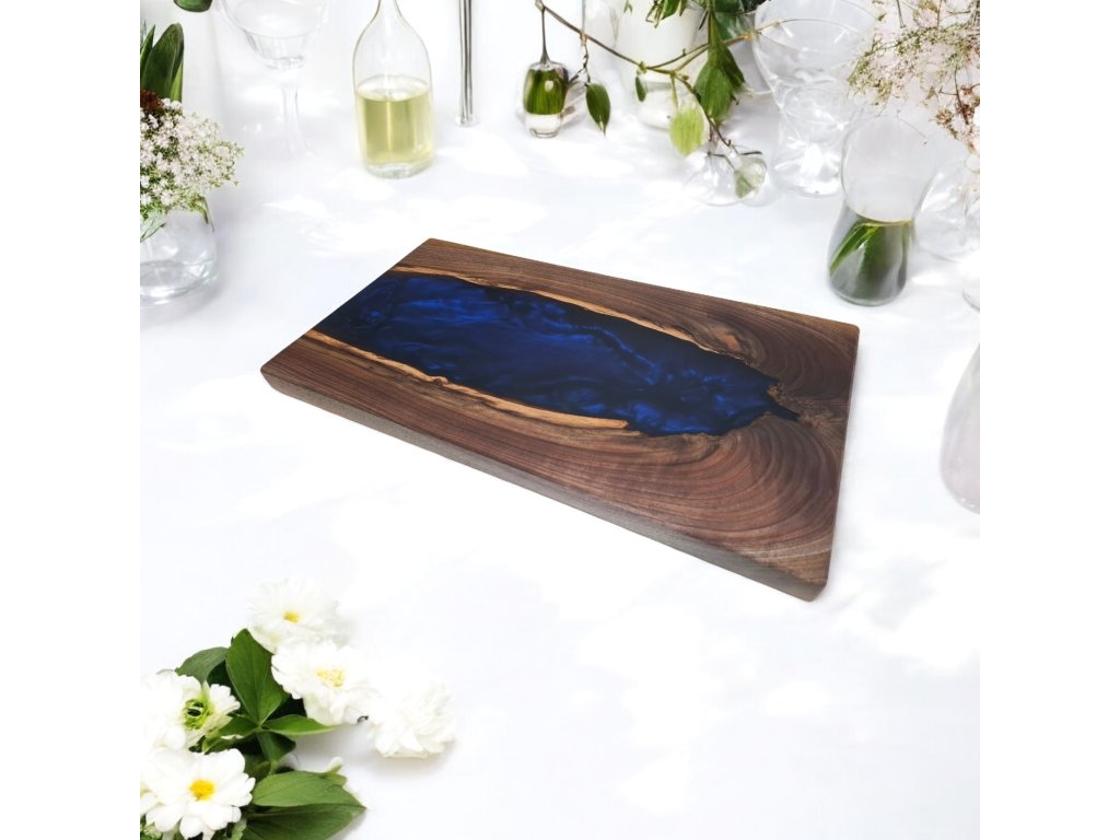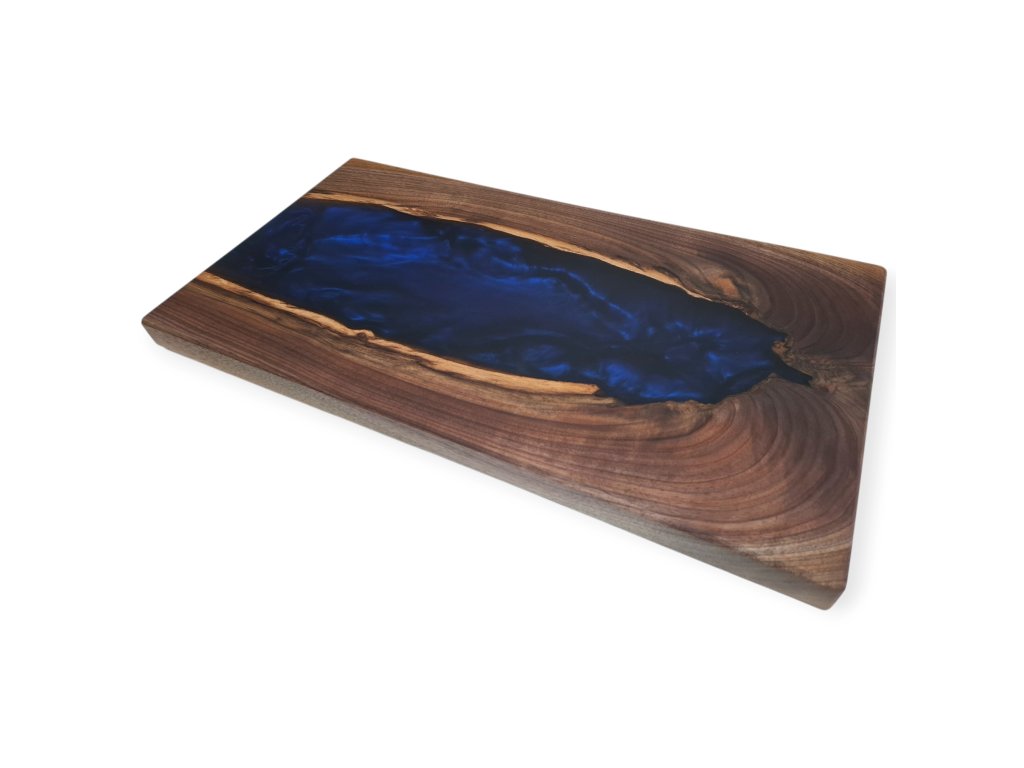 Elegantní servírovací prkénko vyrobené z kvalitního amerického ořechu, doplněné o výraznou tmavě modrou pryskyřici, která vytváří jedinečný efekt. Toto ručně vyrobené servírovací prkénko představuje spojení přírodního dřeva a moderní pryskyřice. Americký ořech, známý svou tmavou, bohatou kresbou a výjimečnou trvanlivostí, tvoří elegantní základ. Do jeho přirozené struktury je zalita tmavě modrá pryskyřice broušená do matného lesku a vytváří tak luxusní vzhled. Každý kus je jedinečný a nikde jinde ho neuvidíte.