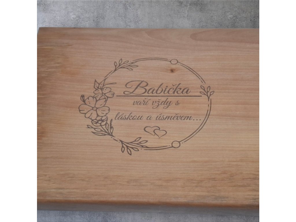Gravírování: motiv s textem „Babička vaří vždy s láskou a úsměvem…“