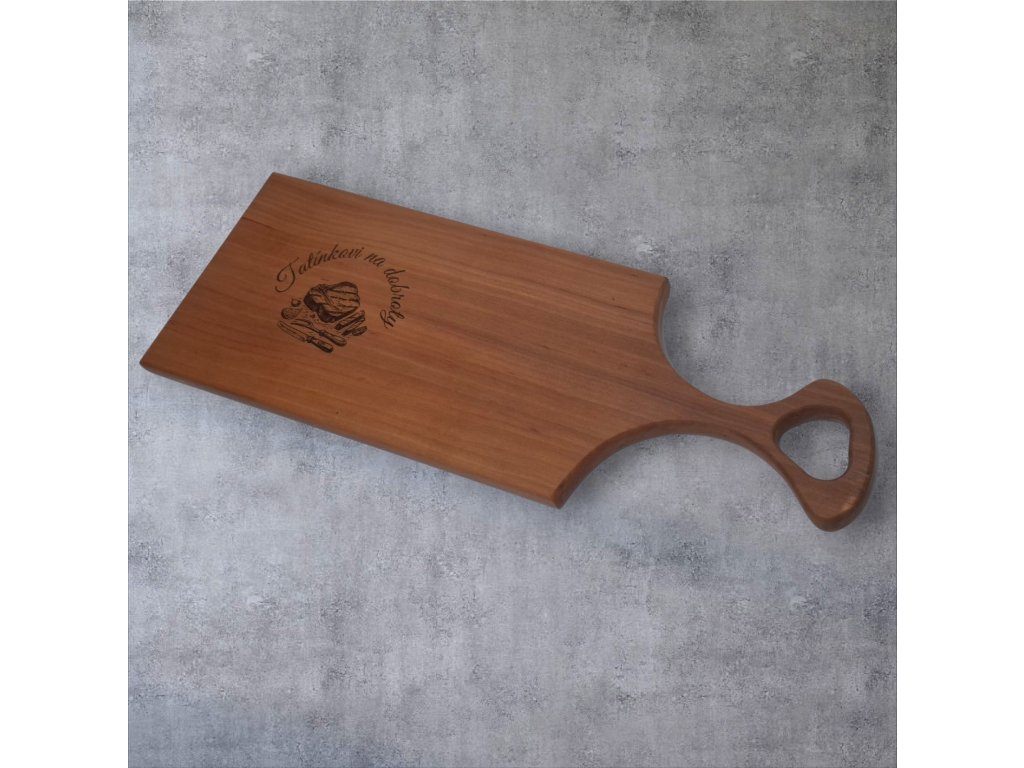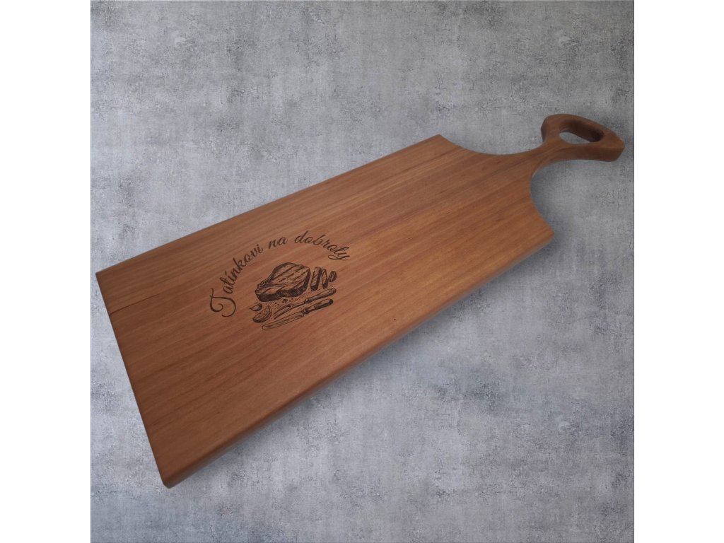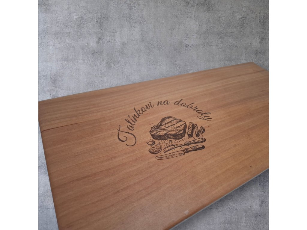 Stylové servírovací prkénko vyrobené ze švestkového dřeva, se zajímavou kresbou a vysokou pevností. Díky preciznímu laserovému gravírování s motivem masa, koření a textem „Tatínkovi na dobroty“ se stane originálním a osobním dárkem pro každého milovníka dobrého jídla.
