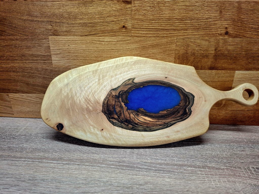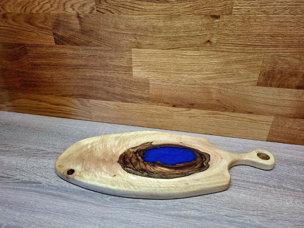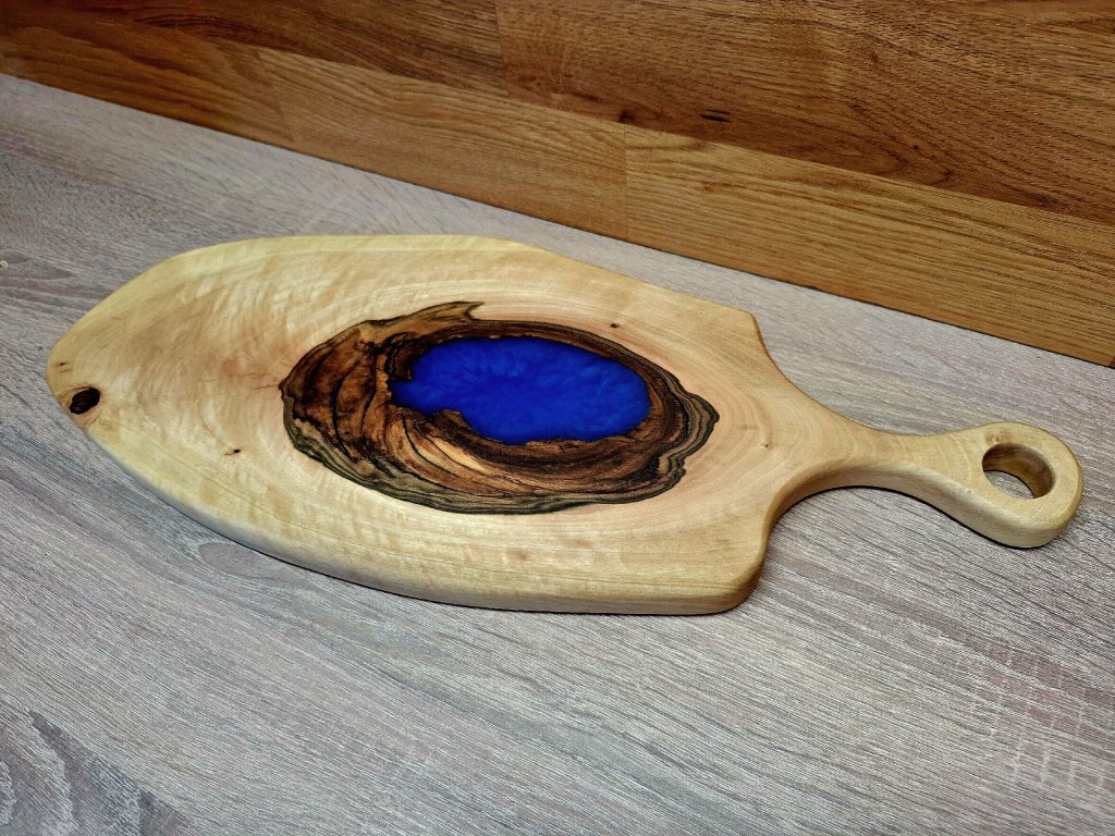 Unikátní ručně vyráběné servírovací prkénko z kvalitního ořechového dřeva, které zaujme svou výraznou kresbou a elegantním designem. Prkénko je ozvláštněno modrou epoxidovou pryskyřicí, která dodává každému kusu jedinečný vzhled – žádné dvě prkénka nejsou stejné.